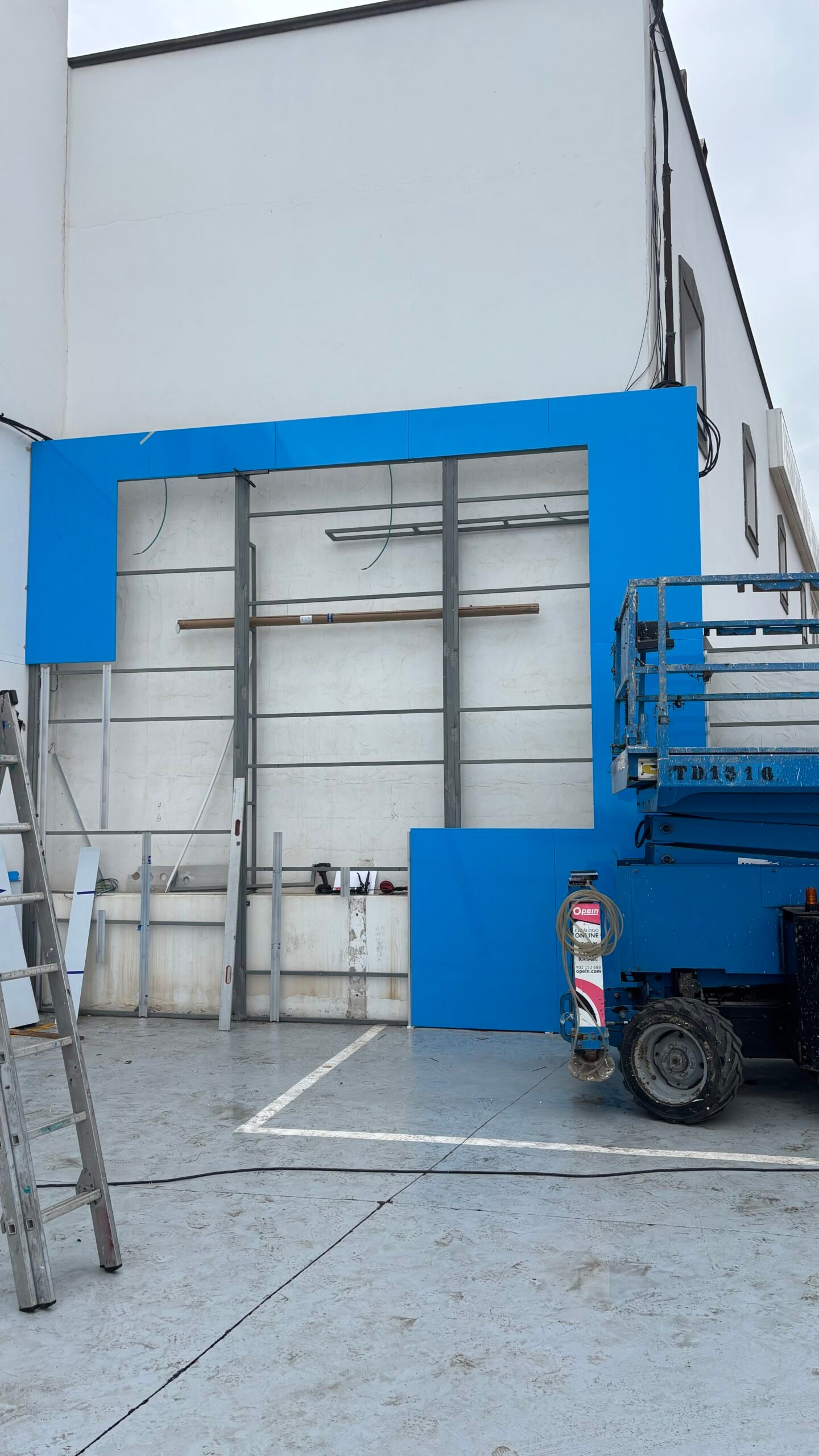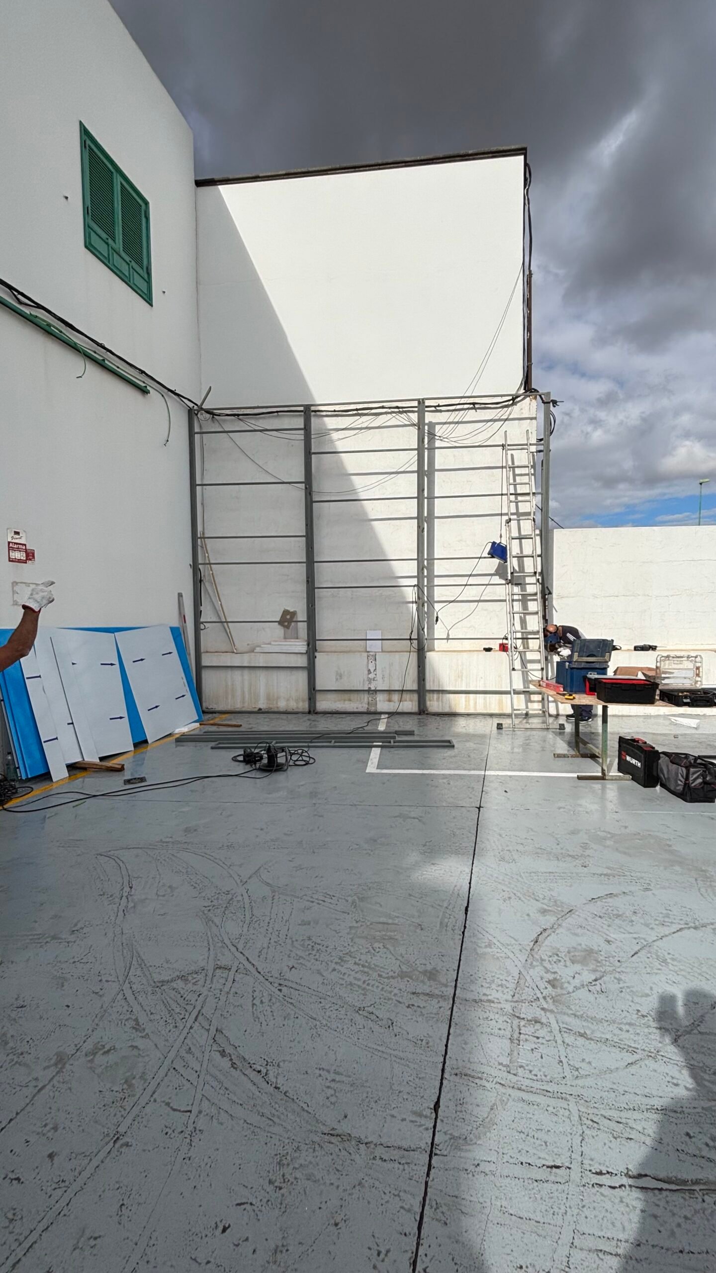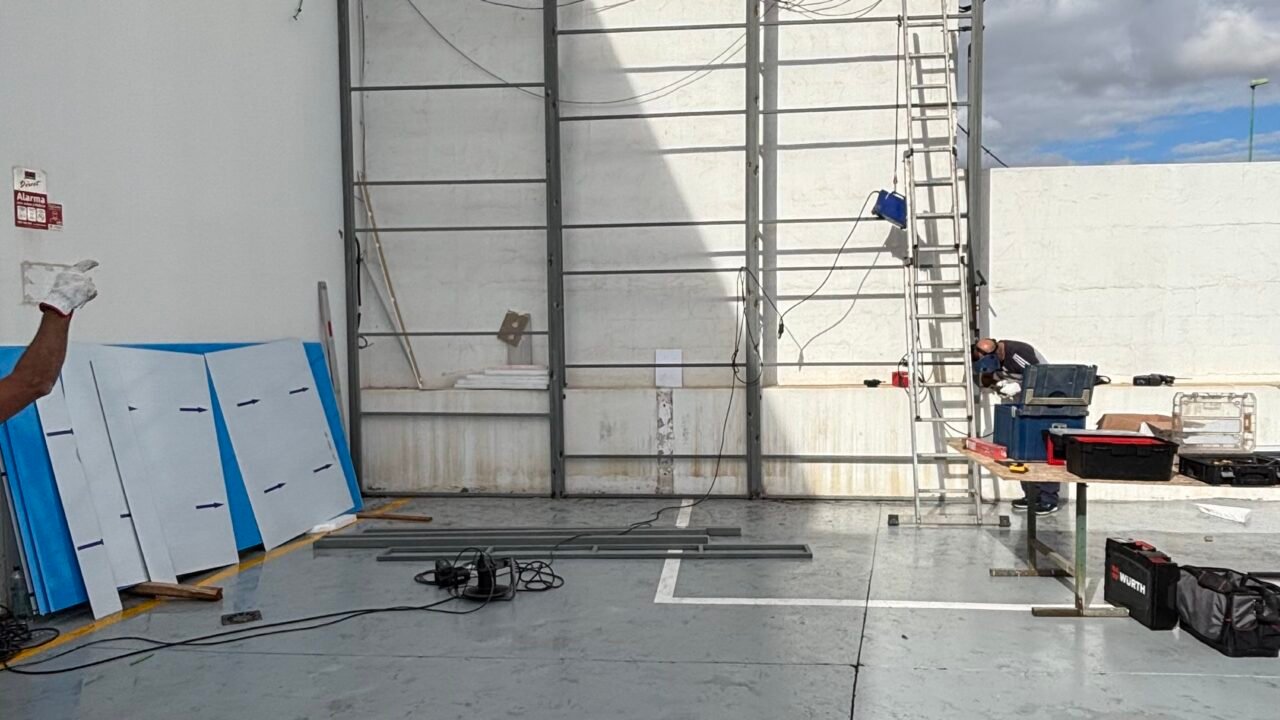 - Tras concretar el desglose y presupuesto, en el taller se fabricaron las estructuras de cuadradillo de hierro, pasando por el proceso de pintura antioxidante. Estas estructuras se situarían en la pared derecha para revestir sobre ellas, y contemplando un espacio para la instalación de la lona.
