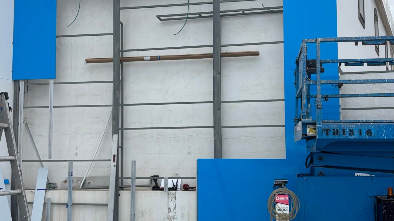 - Continuamos con la parte superior de la entrada, para centrar de forma simétrica los composites y partir de esa simetría hacia los extremos. El revestimiento se hizo sobre rastreles de aluminio. Completamos el resto de la fachada mientras nos encargábamos de situar las letras corpóreas y logotipos en su lugar. Ayudándonos de plantillas previamente preparadas en láser.